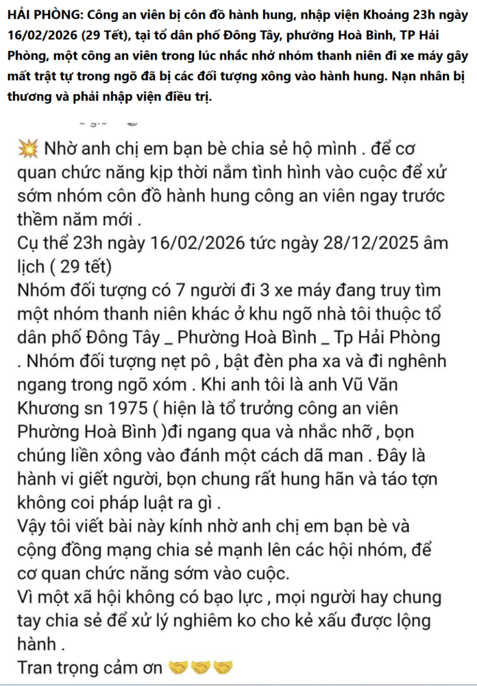 19/02/2026 Tin Tức Hải Phòng: Khoảng 23h ngày 29 Tết, một công an viên trong lúc nhắc nhở nhóm thanh niên đi xe máy g~ây m:â’t trật tự trong ngõ đã b! các đôi’ tư:ợng l@o vào 🤜👊🦵🦵 dmaaan 😢 https://hongbienez.com/wp-content/uploads/2026/02/96xinxQs1.mp4